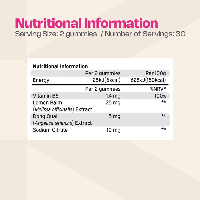 - High-strength dose of Vitamin B6, Lemon Balm, and Dong Quai for women's health support
